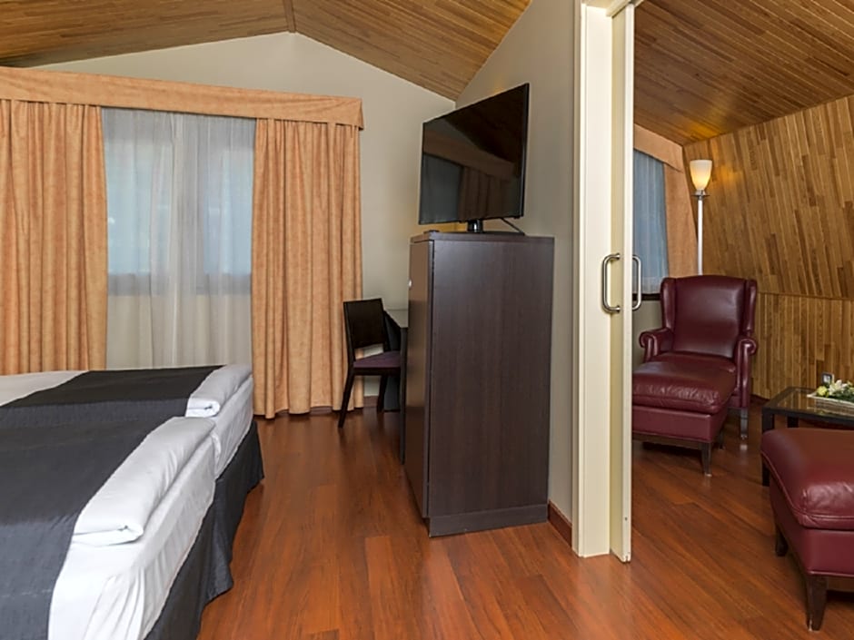 This modern, bright room has central heating and is equipped with satellite TV, a telephone and a mini-bar. The bathroom includes a hairdryer and free toiletries.